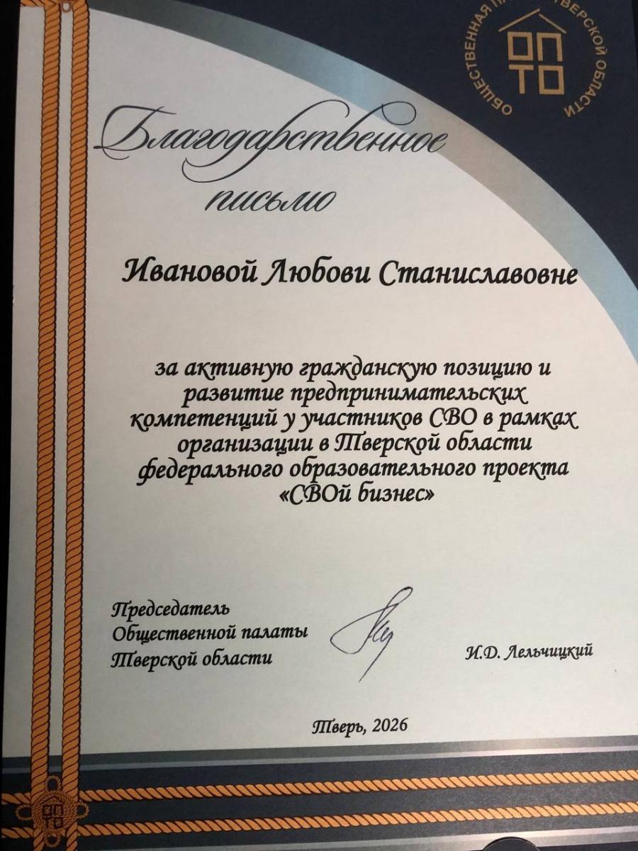 На заседании вручено Благодарственное письмо исполнительному директору Тверского областного отделения «ОПОРЫ РОССИИ» Ивановой Л.С.!